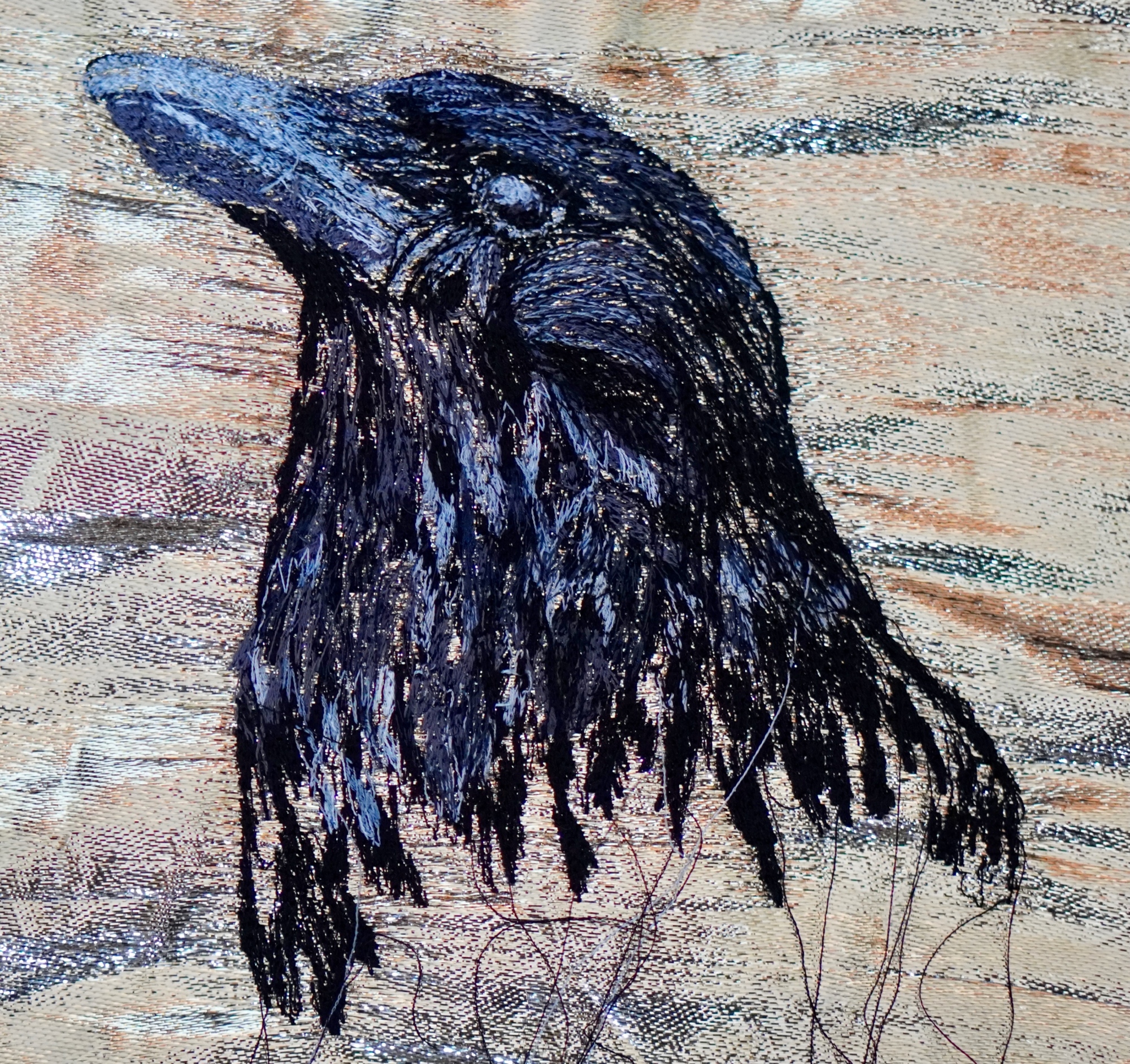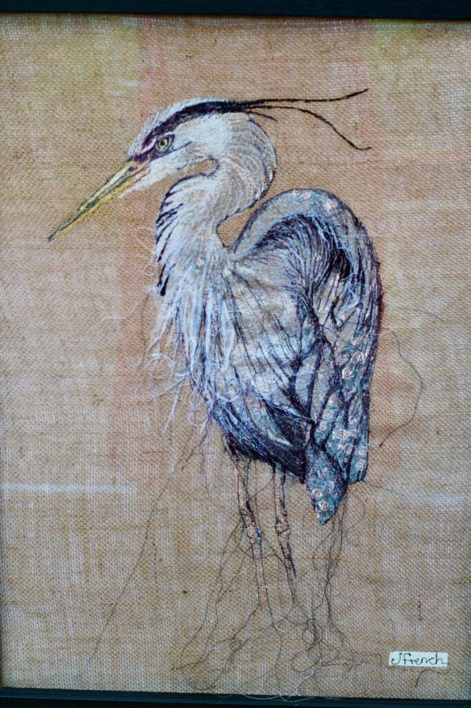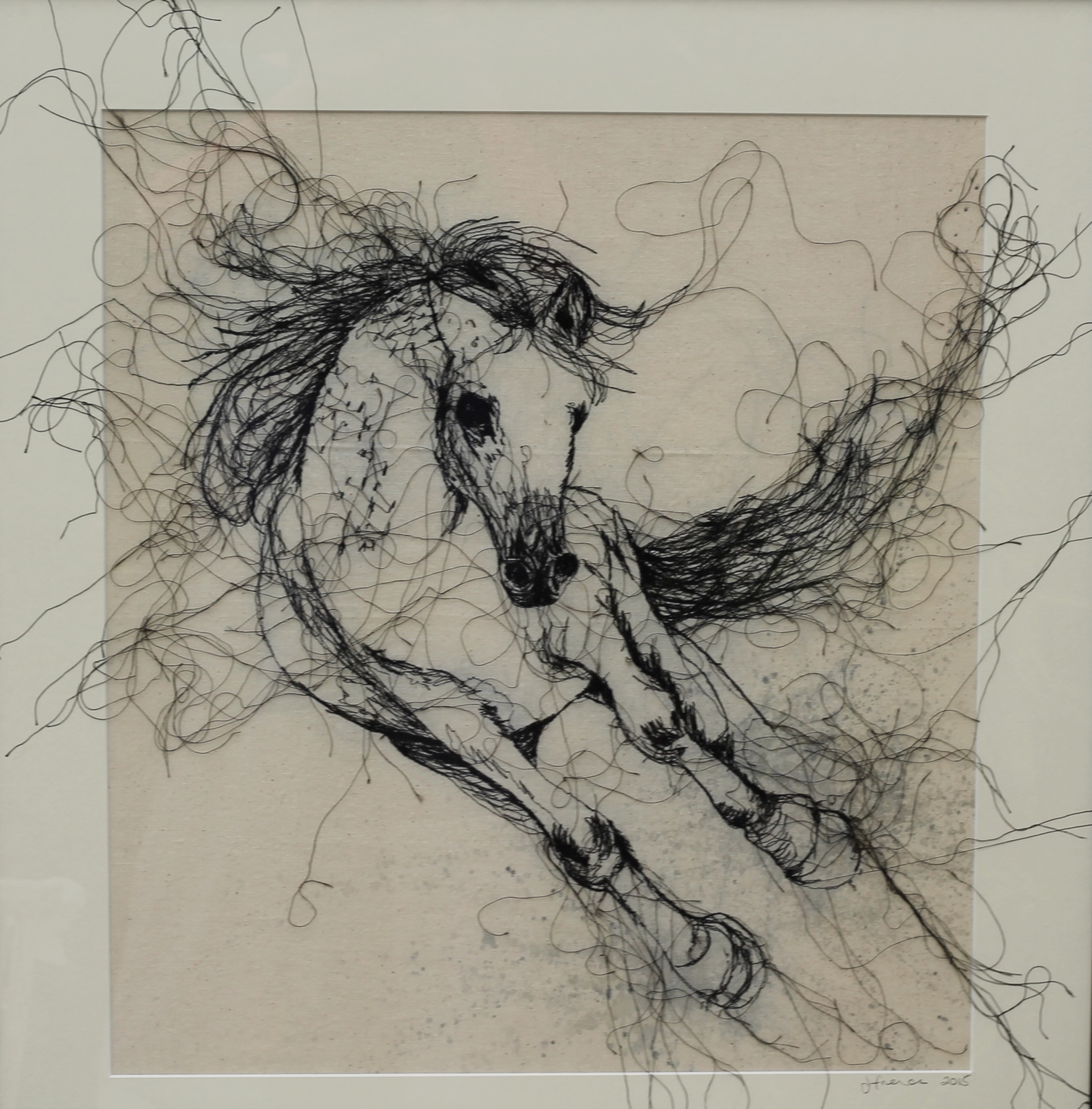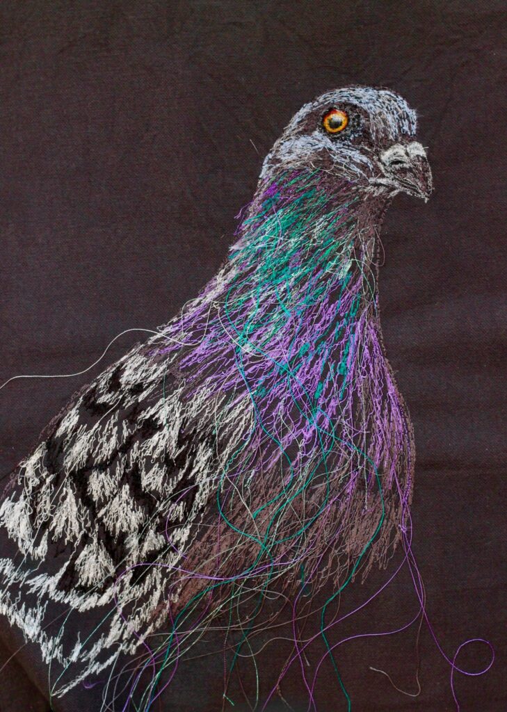 Julie’s work is deeply rooted in personal narrative and observation. Animals—both wild and domestic—frequently appear in her pieces, often inspired by childhood memories or moments of fleeting connection. Her process is intuitive and experimental. Julie embraces the unpredictable nature of stitch, allowing loose threads to dangle or hover around her subjects, creating depth, movement, and a sense of wildness. This approach invites viewers to engage closely with the work, speculating on its construction and the tactile interplay of materials.