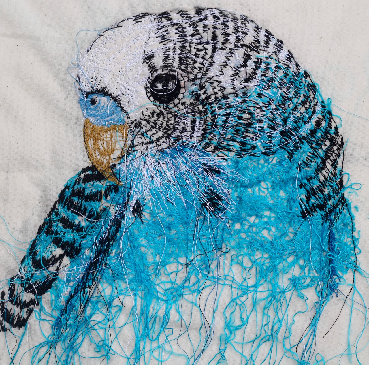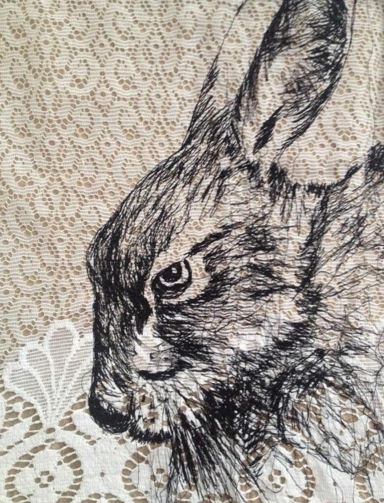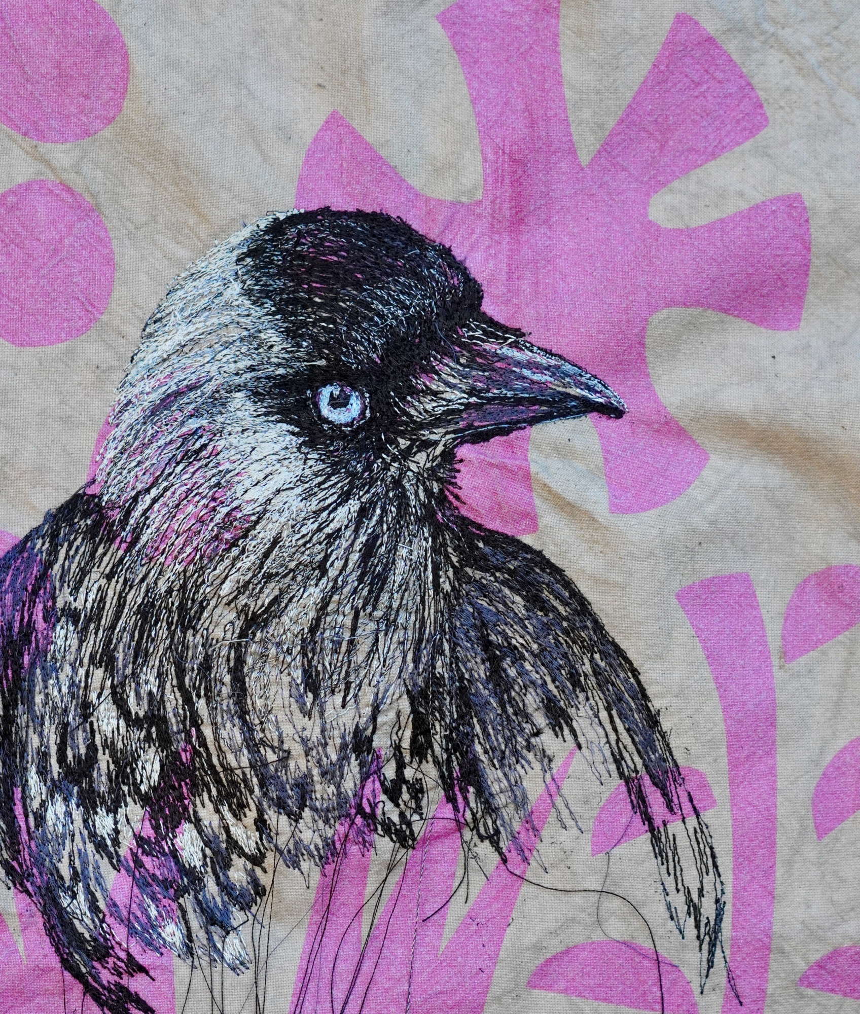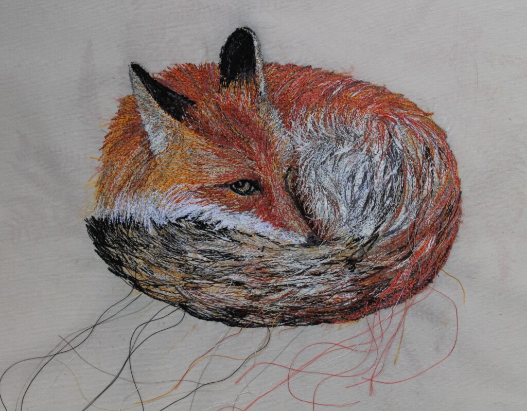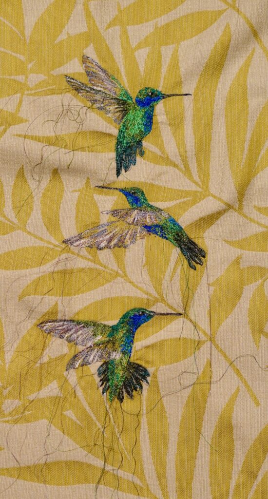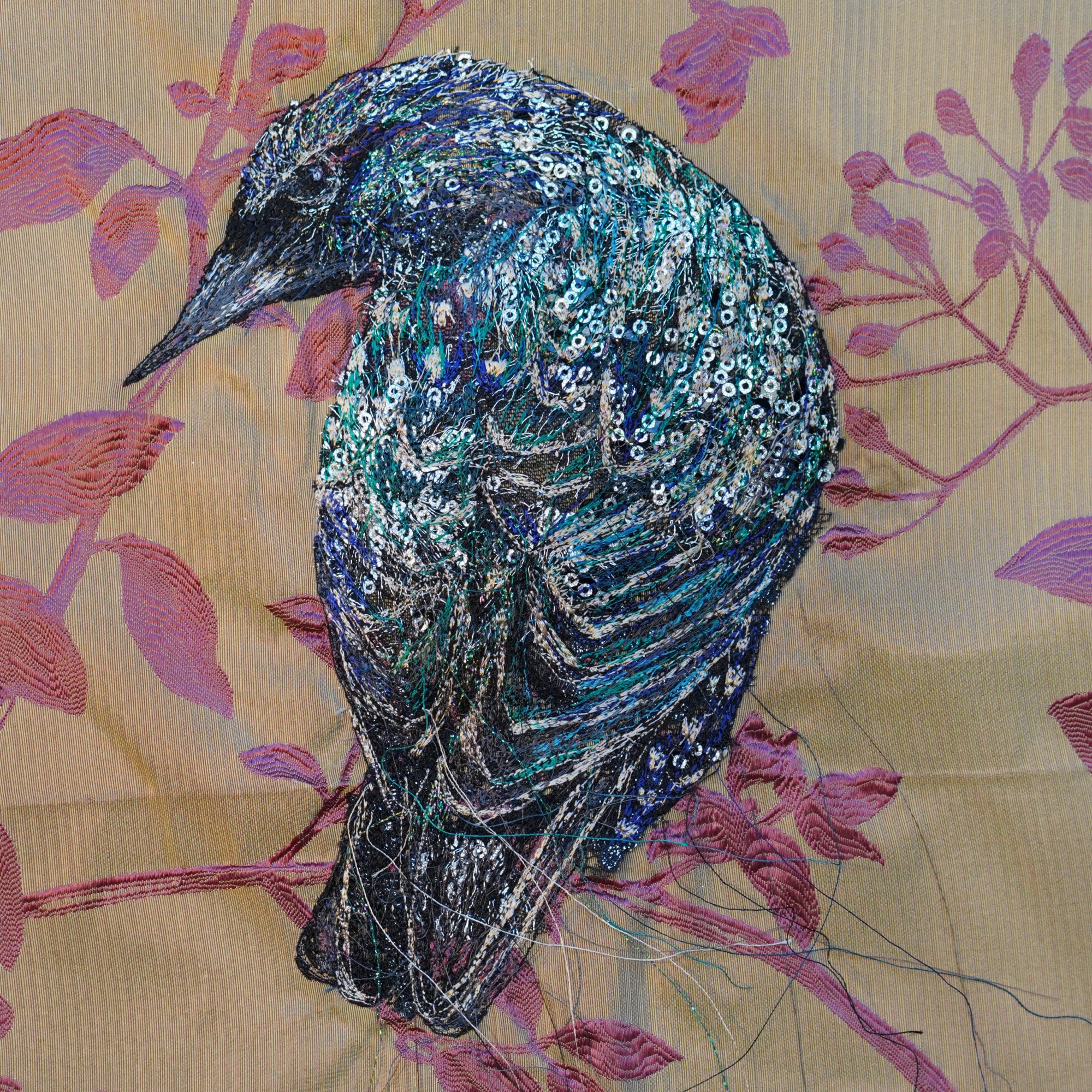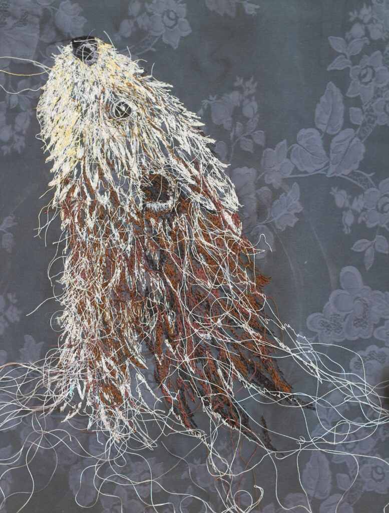 Julie French is a Brighton-based textile artist whose evocative stitched works explore the wild side of nature, movement, and memory. A graduate of East London University (1999) with a degree in Printed Textiles and Surface Decoration, Julie has developed a distinctive practice using the sewing machine as a tool for continuous line drawing. Her free-motion stitch technique transforms reclaimed furnishing fabrics into richly textured compositions that blur the boundaries between drawing, painting, and textile art.