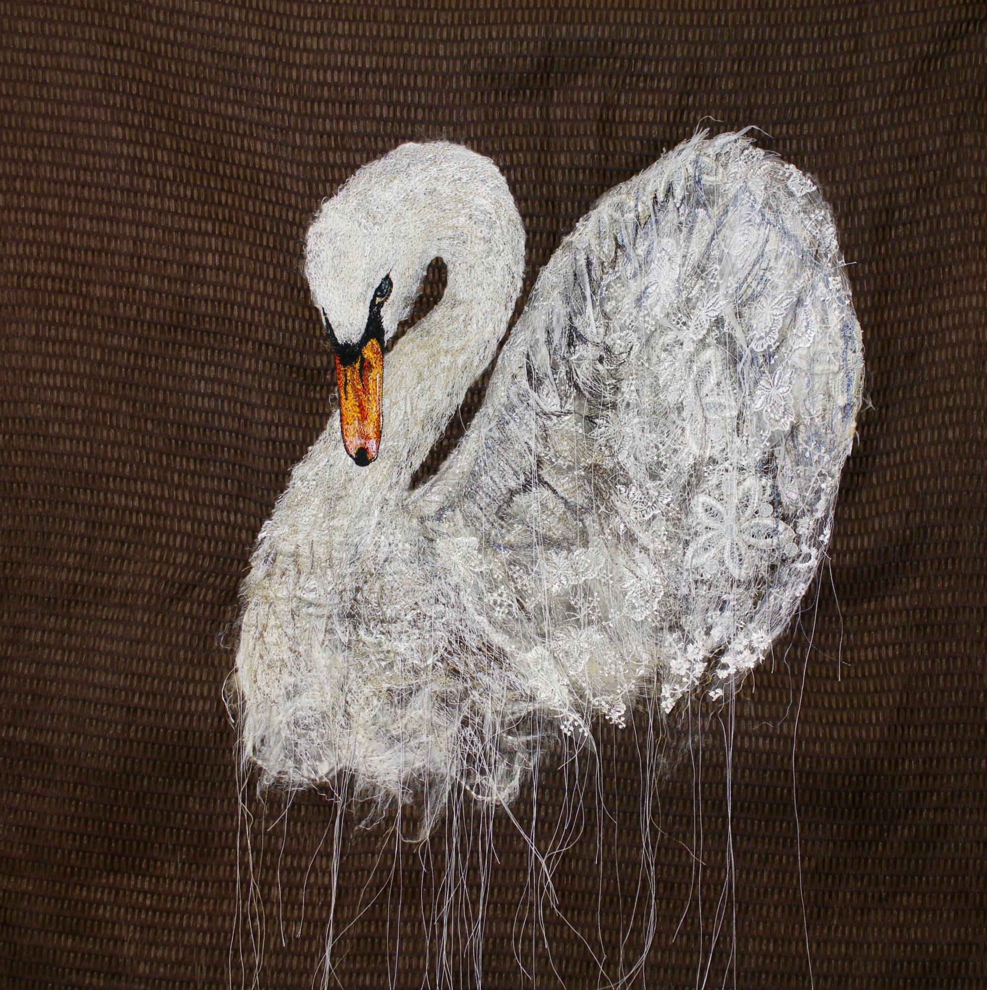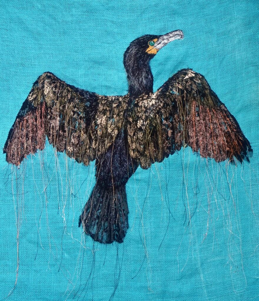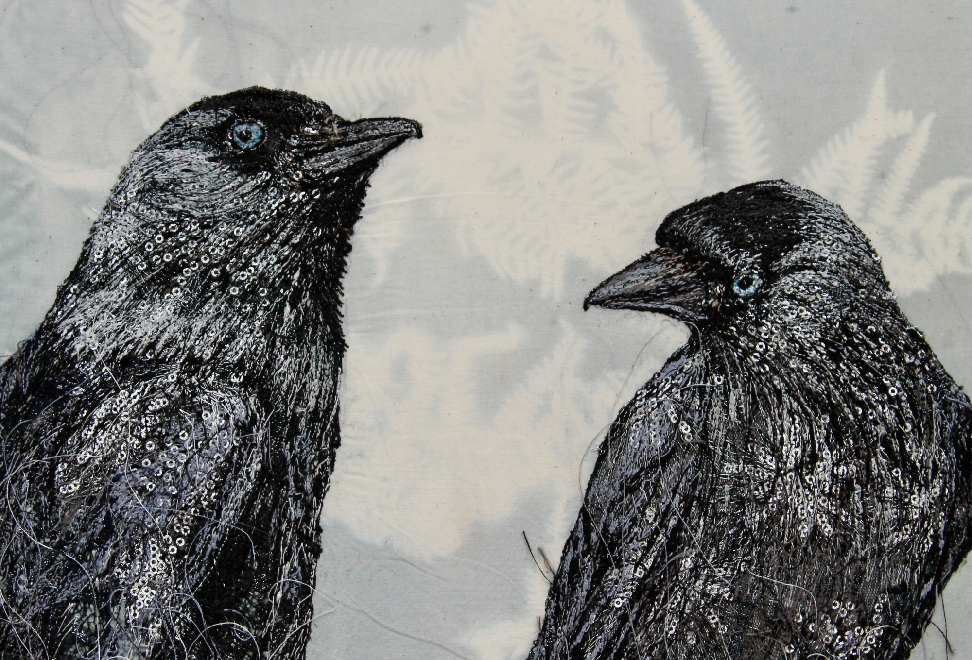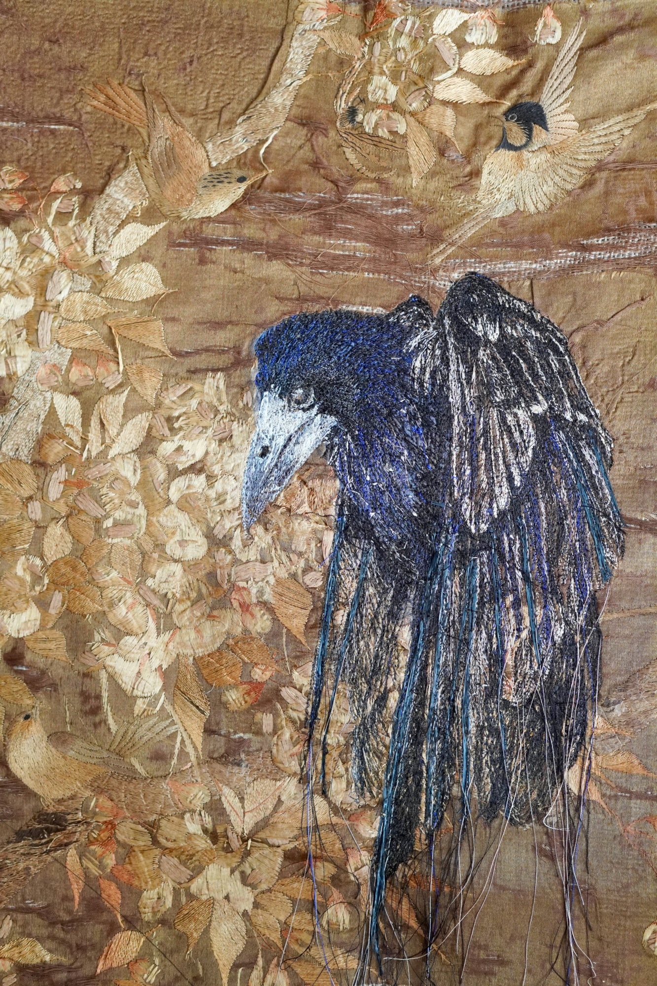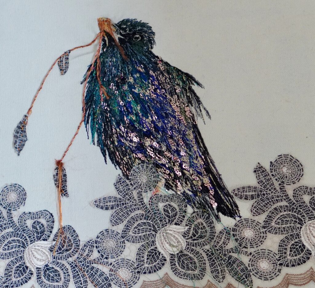 Julie French is a Brighton-based textile artist whose evocative stitched works explore the wild side of nature, movement, and memory. A graduate of East London University (1999) with a degree in Printed Textiles and Surface Decoration, Julie has developed a distinctive practice using the sewing machine as a tool for continuous line drawing. Her free-motion stitch technique transforms reclaimed furnishing fabrics into richly textured compositions that blur the boundaries between drawing, painting, and textile art.